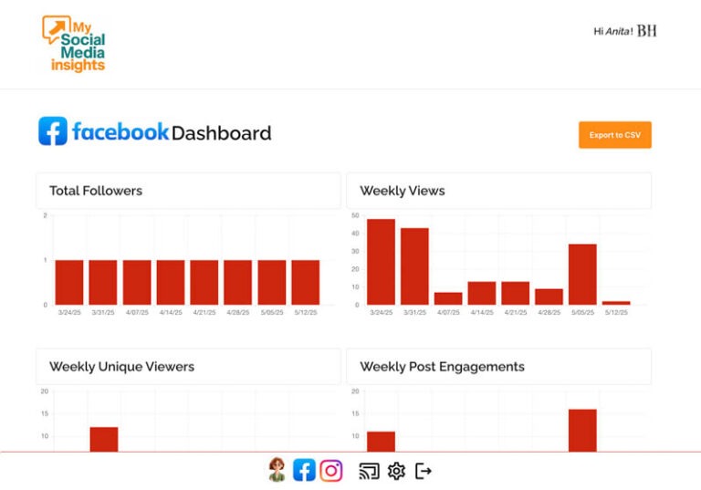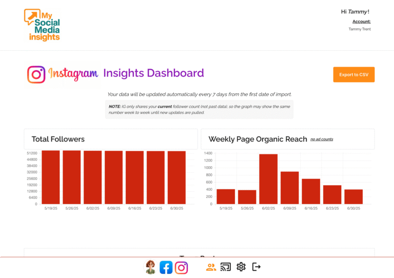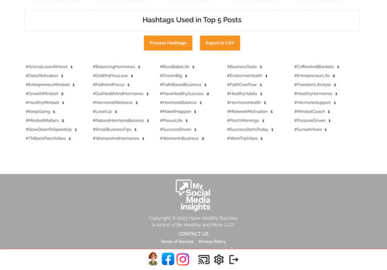 The My Social Media Insights App connects directly to your Instagram and Facebook, analyzes your performance, and gives you done-for-you posts—captions, hashtags, and pro-images—customized to your voice and audience.